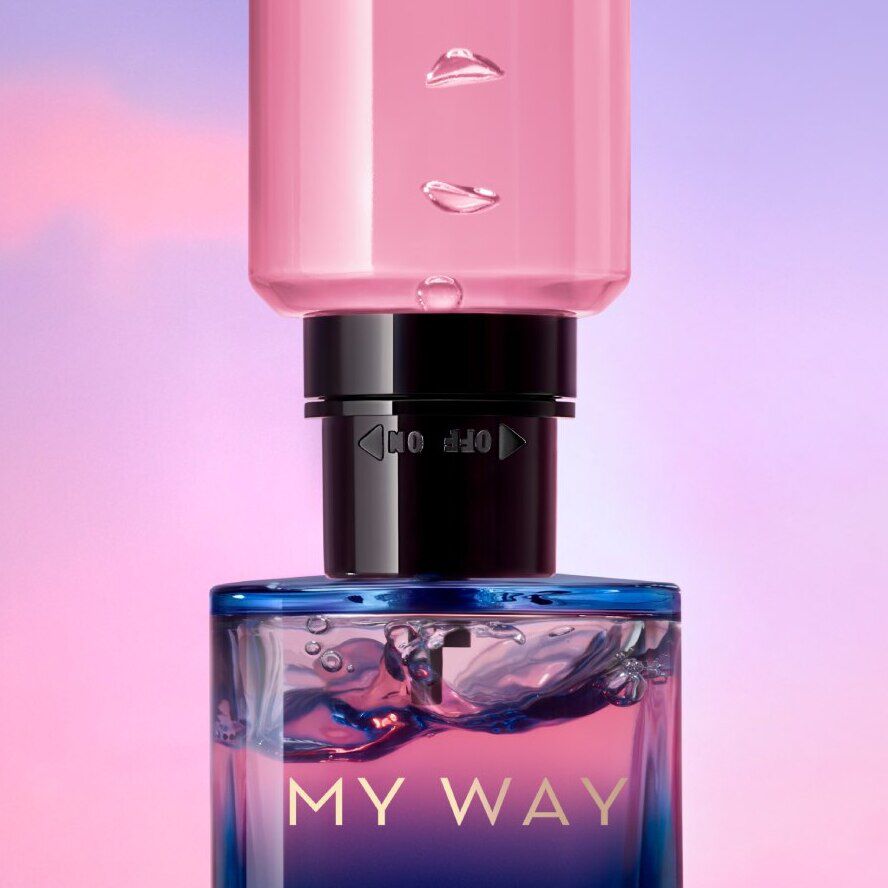 Le nouveau flacon de MY WAY PARFUM crée un contraste saisissant entre son capot bleu profond et son jus rose vibrant. Pour souligner la distinction que fait MY WAY PARFUM entre intensité et éclat, le flacon est habillé de tons qui vont du bleu d'encre à sa base au rose éclatant à son col. Un dégradé qui illustre le contraste entre les notes du parfum, le bleu profond de la base rappelant les facettes de l'iris, tandis que la tubéreuse est symbolisée par le rose du col.